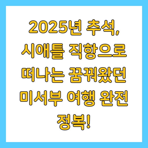 2025년 추석, 꿈꿔왔던 미서부 여행을 시애틀 직항과 함께 현실로 만들어보세요! 꼼꼼한 준비와 함께라면 더욱 완벽한 여행이 될 것입니다. 지금 바로 항공권을 예매하고 잊지 못할 추억을 만들어보세요!