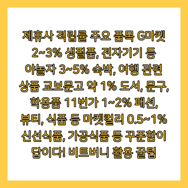 제휴사 적립률 주요 품목 G마켓 2~3% 생필품, 전자기기 등 야놀자 3~5% 숙박, 여행 관련 상품 교보문고 약 1% 도서, 문구, 학용품 11번가 1~2% 패션, 뷰티, 식품 등 마켓컬리 0.5~1% 신선식품, 가공식품 등 꾸준함이 답이다! 비트버니 활용 꿀팁