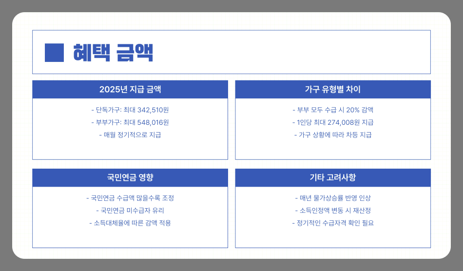 여기서 소득인정액이란 월 소득뿐 아니라 보유 재산도 포함한 계산 값으로, 일정 기준을 초과하면 탈락할 수 있습니다. 단, 공무원연금, 군인연금, 사학연금 수급자 및 그 배우자는 제외됩니다.